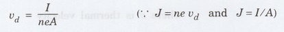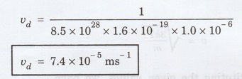 Find the drift velocity of the free electrons in a copper wire whose cross sectional area is 1.0 mm2 when the wire carries a current of 1A. Assume that each copper atom contributes one electron to the electron gas. Given n = 8.5 × 1028 m-3 (A.U. May 2016)
