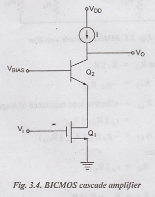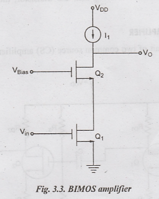 Fig.3.3 shows the BIMOS cascade amplifier. The Common Source (CS) transistor Q1 conducts a current signal due to input signal voltage Vi.