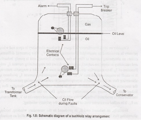 Main Components of Transformers are: i. Magnetic Core, ii. Windings, iii. Insulation for Windings, iv. Conservator (or) Tank, v. Cooling arrangement, Temperature Gauge, Oil Gauge, vi. Buchholz relay, vii. Silica gel breather, viii. Bushings (either of porcelain, oil-filled or capacitor type).