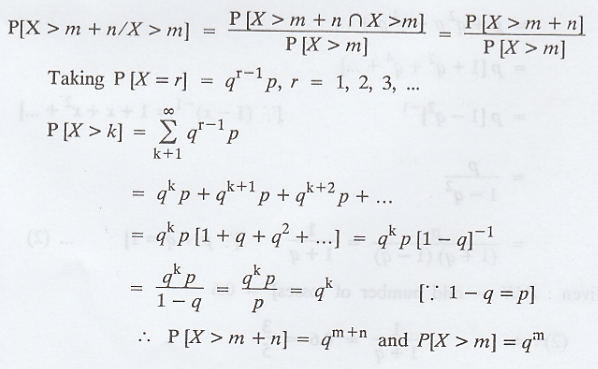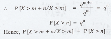 for any two positive integers 'm' and 'n', P[X > m + n / X > m] = p[X