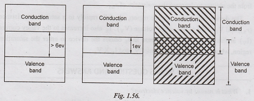Draw the energy band diagram for conductors, semiconductors and insulators.