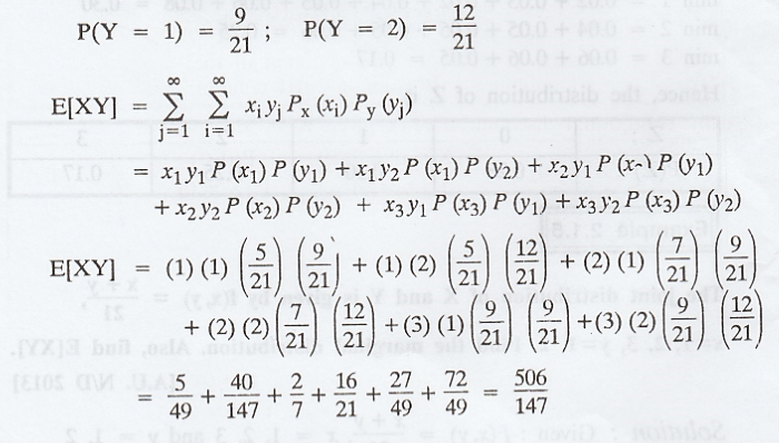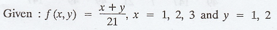 joint distribution of X and Y is given by f(x,y) = x+y/21, x = 1,2,3 y = 1,2. Find