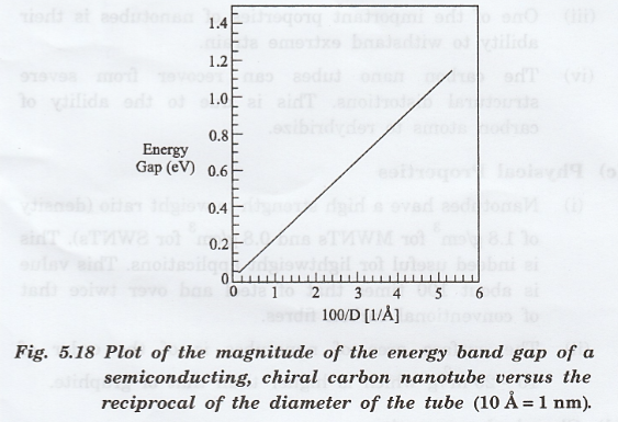 ii. The energy gap of semiconducting chiral carbon nanotubes is inversely proportional to the diameter of the tube as shown in fig 5.18.